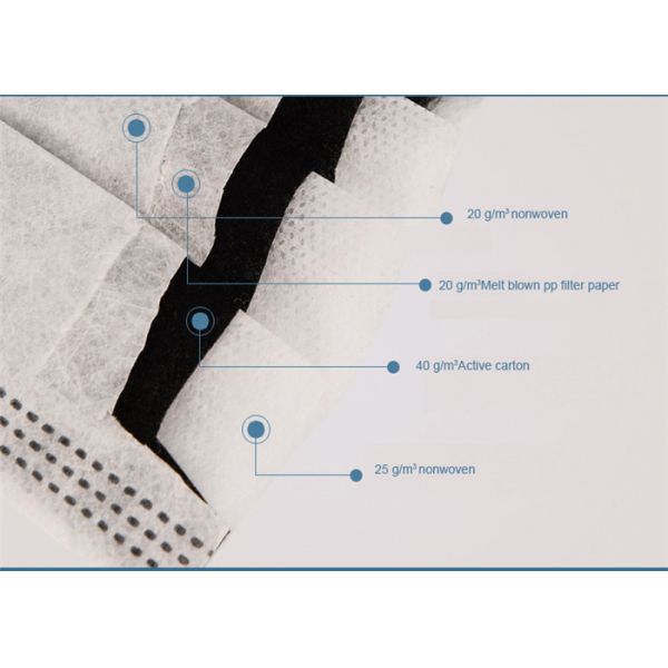 Made of Non woven + Activated Carbon + Filter Paper + Non woven. A full-width nose piece guarantees a proper fit.